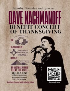 In a surprise Thanksgiving reappearance, Dave Nachmanoff will perform in Keene, NH at Congregation Ahavas Achim (CAA), 84 Hastings Ave., on Saturday, Nov 22, at 7pm (doors open 6:30). This concert is co-sponsored by CAA and MIP with proceeds benefitting The Community Kitchen (TCK). Kindly RSVP to this link for planning purposes. Use the link also if you’d like to join the pop-up choir (rehearsal at 6pm). Donations of canned goods will be collected at the door.