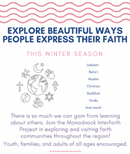 Our MIP intern, Alaria Clauss, is organizing family visits to local faith communities to build interfaith understanding in the Monadnock region. Specific dates are still being arranged. Everyone is welcome, and we especially encourage youth and families to take advantage of this educational opportunity.